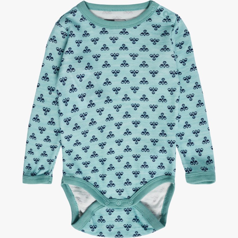 Langermet body i myk, elastisk kvalitet med Hummel print. Bodyen har ull på utsiden og bambusviskose på innsiden.