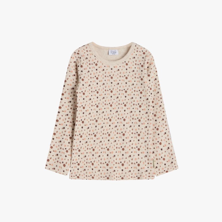 Langermet bomullsgenser i mykt ribbestoff med blomstertrykk. Rund hals og normal passform. Dette produktet er laget av 95 % økologisk bomull.
