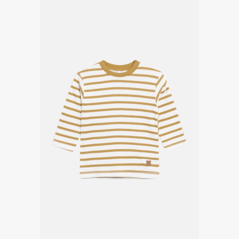 Langermet T-skjorte i myk stretch med striper. De hvite stripene er bredest på forstykket, og på bakstykket er det omvendt. Modellen kneppes på venstre skulder, og den har et lite skinnmerkat nederst foran til venstre.