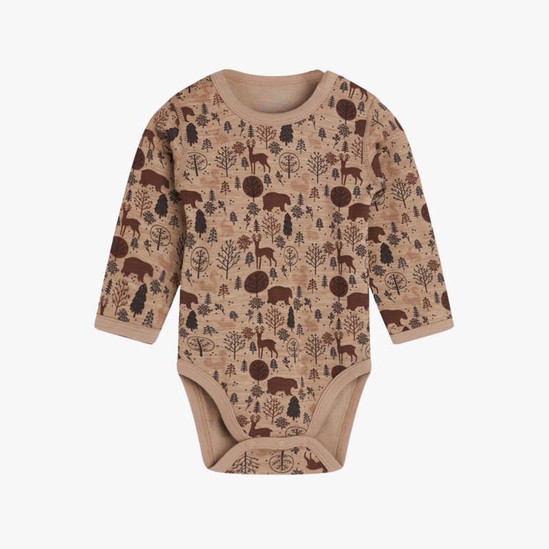 Langermet body i behagelig, elastisk ull og viskose av bambus. Bodyen kommer med et hyggelig trykk av naturelementer og kneppes på venstre skulder og mellom beina. Produktet er Oeko-Tex 100®-sertifisert.