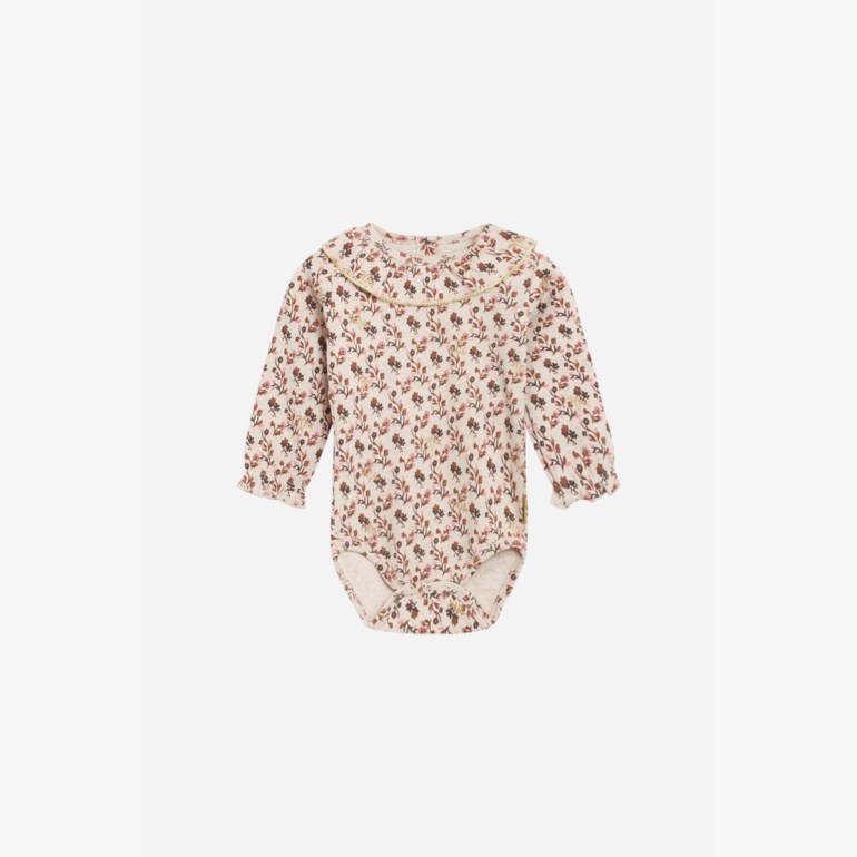 Body i elastisk ribbestoff med blomstertrykk og glitterdetaljer. Modellen har volangkrage rundt halsen og strikk i ermene. Kneppes midt på ryggen og mellom bena. Dette produktet er sertifisert med Contains Organic Cotton.