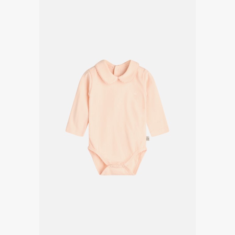 Langermet body med søt volangkrage til jente. Body med skarp krage til gutt. Begge bodyer har en krone på venstre bryst og lukkes i nakken og mellom bena. Dette produktet er sertifisert med GOTS (Global Organic Textile Standard).