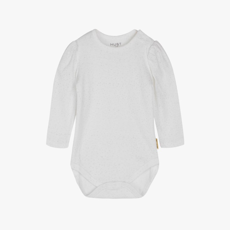 Langermet body med hullmønster og gulldetaljer. Kneppes på venstre skulder og mellom bena.