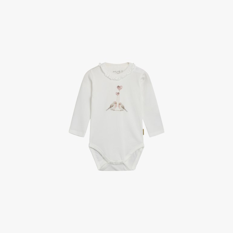 Langermet body i myk, elastisk bomullskvalitet med fugler på brystet og volangkrage. Kneppes på venstre skulder og mellom bena. Dette produktet er sertifisert med Contains Organic Cotton.