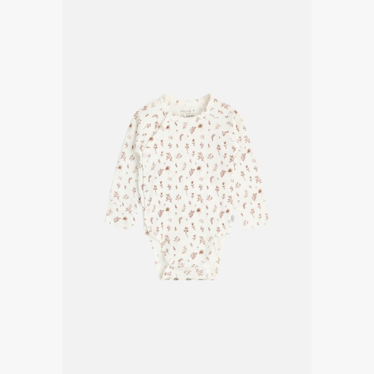 Langermet body med blomster- eller traktortrykk med omslagslukking på høyre side og knepping mellom bena. Dette produktet er sertifisert med GOTS (Global Organic Textile Standard).