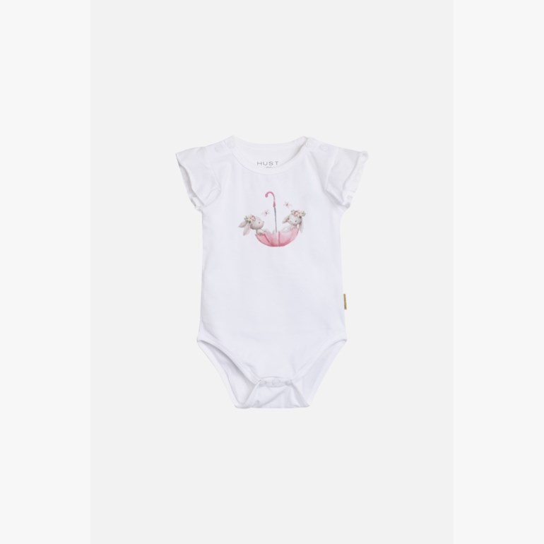 Body i myk og elastisk jersey med volanger på skuldrene og trykk av to kaniner som sitter i en paraply, på brystet. Kneppes på skuldrene og mellom bena. Dette produktet er sertifisert med Contains Organic Cotton.