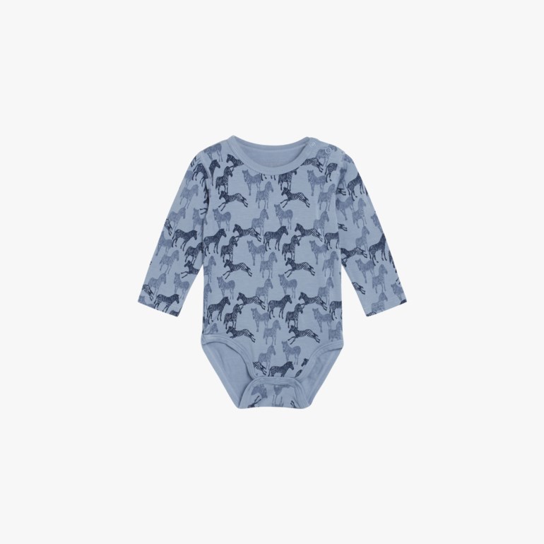 Langermet body i elastisk bambusjersey med zebratrykk. Modellen kneppes på venstre skulder og mellom bena. Dette produktet er Oeko Tex 100 sertifisert.