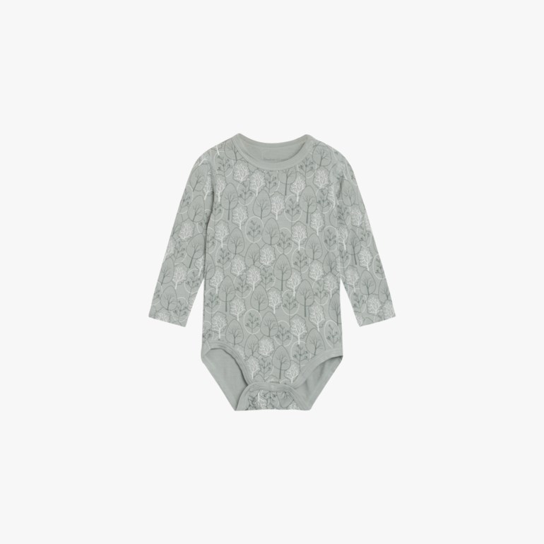 Langermet body i elastisk bambusjersey med tretrykk. Modellen kneppes på venstre skulder og mellom bena. Dette produktet er Oeko Tex 100 sertifisert.