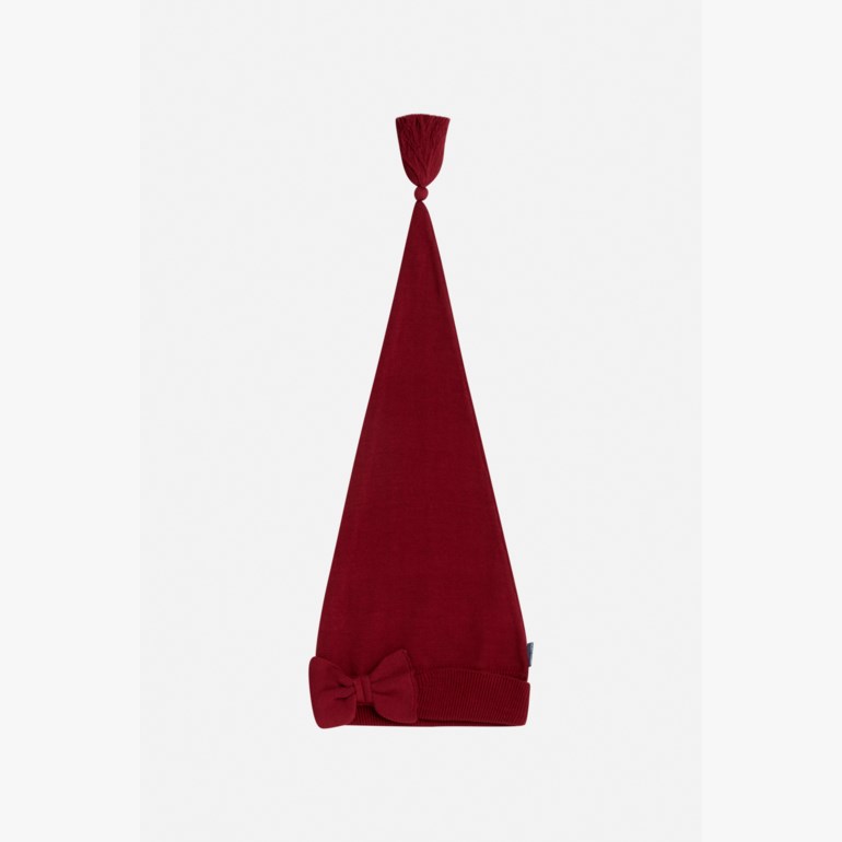 Lang og strikket nisselue med sløyfe og dusk i enden. Perfekt til jul! Dette produktet er sertifisert med Contains Organic Cotton.