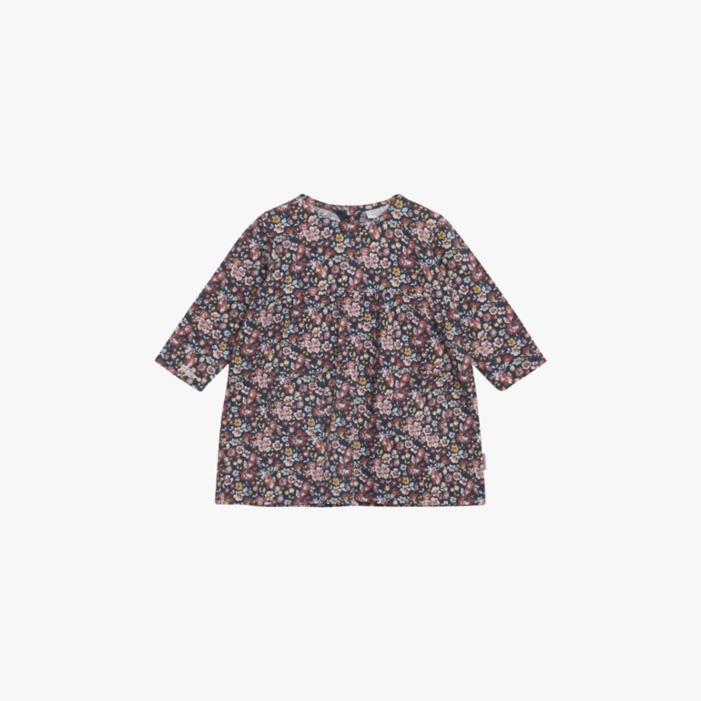 Bomullskjole med blomstertrykk. Modellen har en skjæring med masser av rynk ved brystet for å gi god vidde nederst. Kjolen har to lommer foran og kneppes på midten bak. Dette produktet er sertifisert med GOTS (Global Organic Textile Standard).