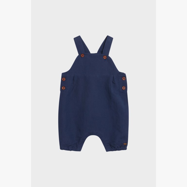 Baggy overall i vevd stoff med knappelukking midt foran ved skulderstroppene og på sidene samt trykknapper mellom bena. Modellen er skåret midt foran øverst og har strikk i bena.