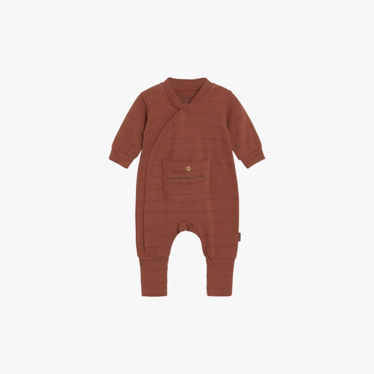 Langermet heldress i elastisk, mønstrete stoff med lomme på magen. Heldressen lukkes med trykknapper i et omslags-look langs høyre side.Dette produktet er Oeko Tex 100 sertifisert.