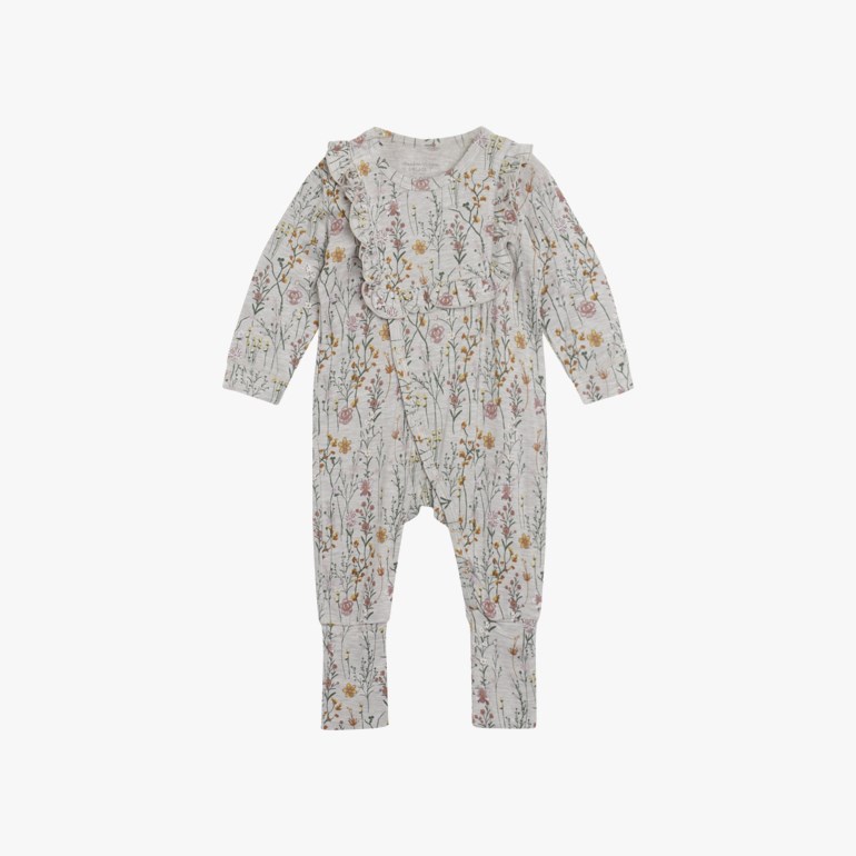 Langermet heldress i myk, elastisk bambusjersey med blomstertrykk. Dressen har et bærerstykke med en volangkant foran og kneppes lettere asymmetrisk fra høyre skulder og ned til venstre fot. Ved føttene er det påsatt en foldefot som man kan få foten gjennom, men som også kan foldes og brukes som en sokk. Det er foldefot opp til størrelse 86. Dette produktet er Oeko Tex 100 sertifisert.