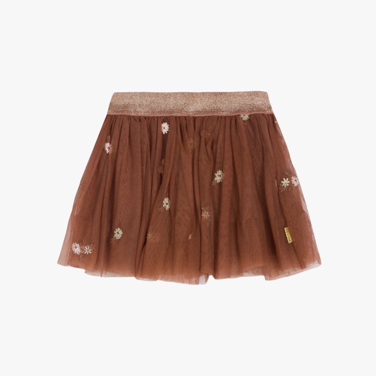 Skjørt med flere lag tyll med broderte blomster på utsiden og mykt underskjørt på innsiden. Skjørtet har strikk i livet.
