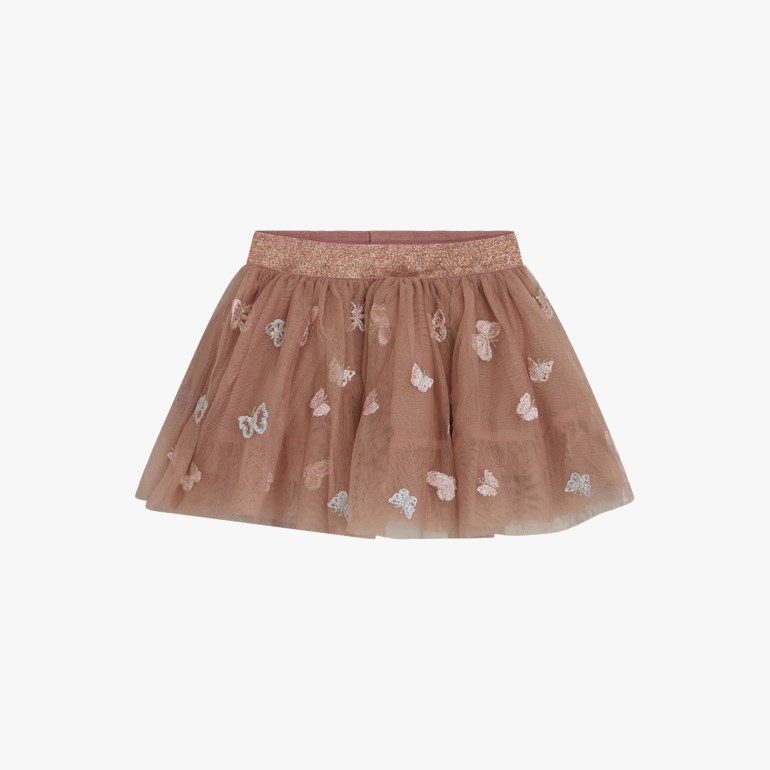 Skjørt med flere lag tyll med broderte sommerfugler på utsiden og mykt underskjørt på innsiden. Glitrende strikk i livet.