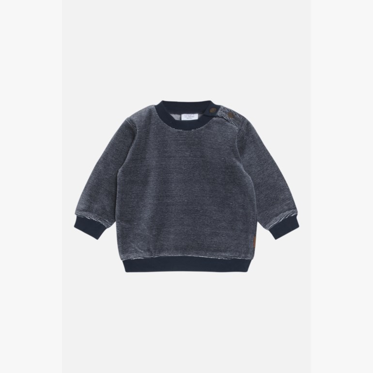 Sweatshirt i elastisk velur med små striper. Kneppes på venstre skulder. Modellen har et lite skinnmerkat på venstre erme. Dette produktet er Oeko Tex 100 sertifisert.
