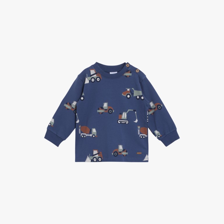Sweatshirt i elastisk stoff med trykk av ulike gravemaskiner. Kneppes på venstre skulder. Dette produktet er sertifisert med GOTS (Global Organic Textile Standard).