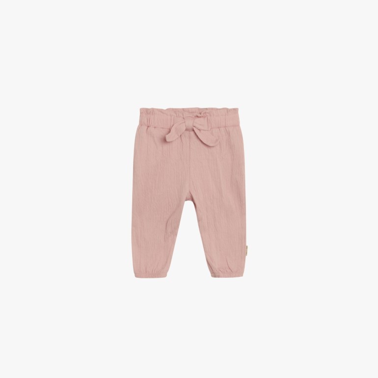 Bukse i behagelig, elastisk bomullskvalitet. Modellen har strikk i livet og bena samt en pyntesløyfe foran i midjen.