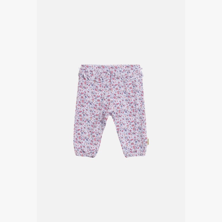 Baggy bukse i elastisk stoff med blomstermønster. Modellen har en volangdetalj rundt midjen samt strikk i midjen og bena. Dette produktet er Oeko Tex 100 sertifisert.