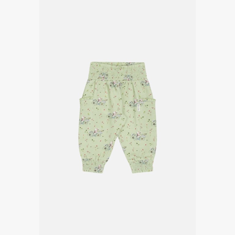 Bukser med trykk av en kanin på sykkel og blomster. Modellen har elastisk vaffelsøm i livet og bena samt lommer med volangkant på siden av buksebena. Dette produktet er sertifisert med GOTS (Global Organic Textile Standard).