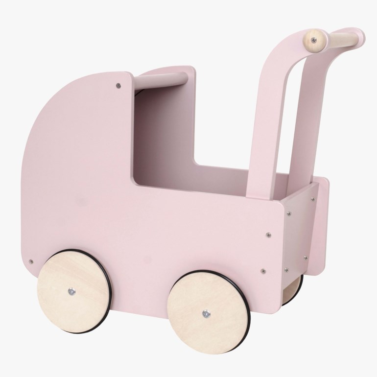 Rosa dukkevogn i treverk fra Jabadabado. Pakk favorittdukken eller bamsen godt inn og ta den med på trilletur enten inne i stuen eller ute i tørt vær. Vognen måler 43 cm i lengden og passer dermed til de fleste dukker og bamser, og den har et flott, nostalgisk design som gjør seg godt på barnerommet. Gummierte hjul sørger for at den triller stille over gulvet og ikke lager skrapemerker.
