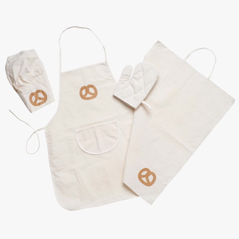 Dette settet med kokkeklær inkluderer fire håndsydde plagg og kjøkkenutstyr dekorert med en søt pretzel. Laget i myk bomull, tåler dette settet mange år med kreativ lek. Det er ideelt både som tilbehør til lekekjøkkenet og for barn som liker å hjelpe til på kjøkkenet.