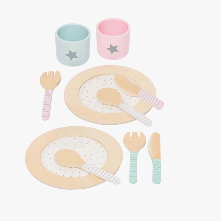 Sett med servise i tre fra Jabadabado, perfekt til servering av lekemat på lekekjøkkenet. Inkludert i pakken er: