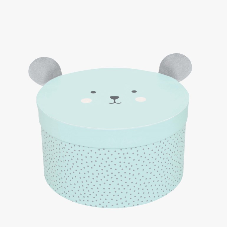 Oppbevaringseske i papp fra Jabadabado, til leker, tegnesaker, skatter og annet. Boksen er rund og dekorert med prikker, kaninansikt og ører. Fint og praktisk tilskudd til barnerommet.