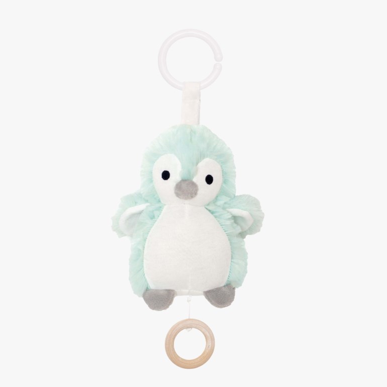 Fin spilledåse formet som en søt og myk kosebamse. Kan henges i barnevognen, på babygymmen eller i sengen ved hjelp av den medfølgende kroken. Trekk i treringen og hør dyret spille en beroligende melodi.