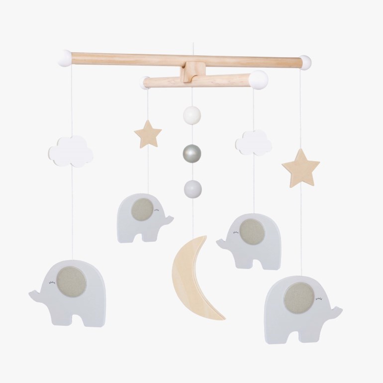 Uro i tre fra Jabadabado som kan henge over babysengen eller stellebordet. Uroen kommer med søte elefanter, måner og stjerner i duse, fine farger. En uro bidrar til å stimulere babyens sanser og bevegelse de første månedene. Henges fra taket eller fra en uroarm (selges separat).