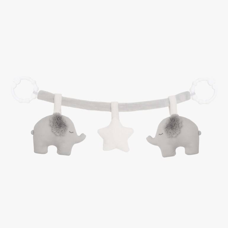 Vognlenke med søte, myke venner formet som elefanter. I begge ender er det montert en krok i plast som gjør at lenken kan henges på kalesjen på de fleste barnevogner. Fin underholdning for de minste ute på trilletur.