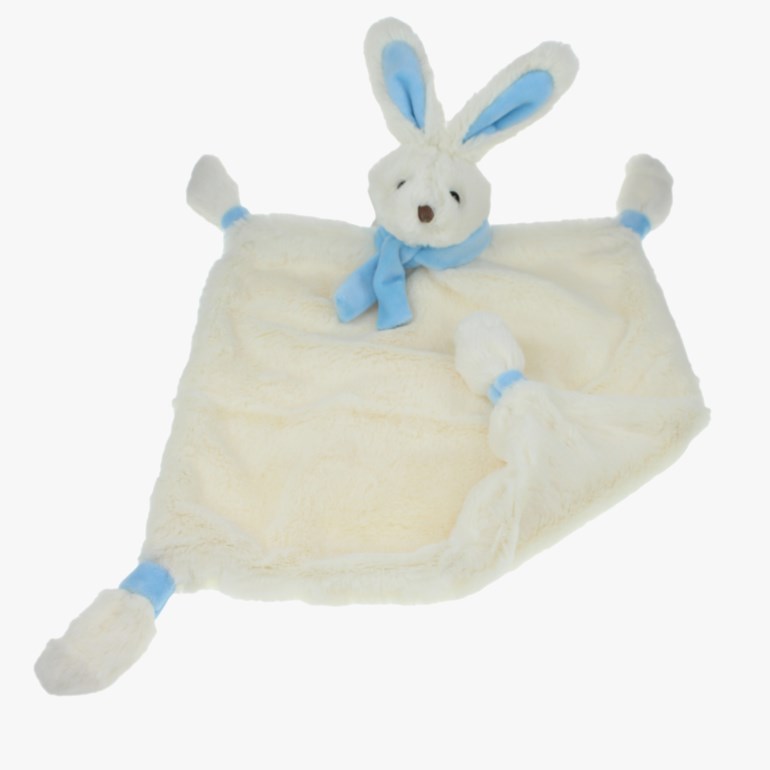 Myk og god koseklut med kaninbamse fra Tinka Baby. Kaninen har blått tørkle i halsen og lange søte ører med rosa plysj.
