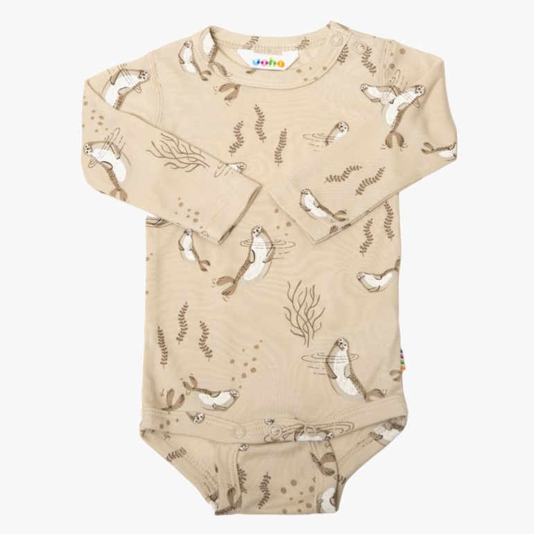 Body med lange ermer. Trykkknapper på den ene skulderen og mellom bena. En utrolig myk kvalitet basert på 100% økologisk bambus som er veldig deilig å ha på seg. Søt trykk. Øko-tex 100 etikett.