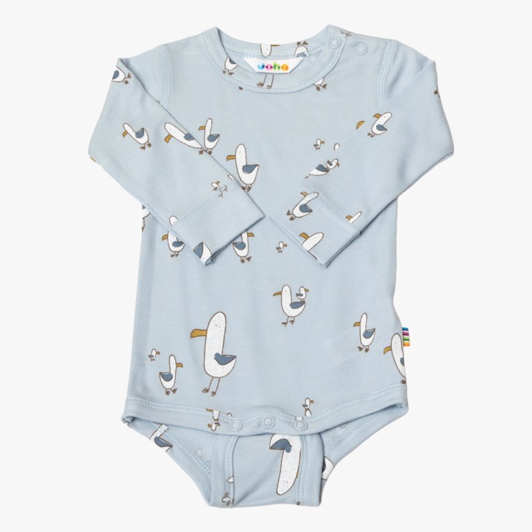 Myk body med lange ermer fra Joha. Praktiske trykknapper på den ene skulderen og mellom beina for enkel påkledning. Laget i en deilig, myk viskosekvalitet basert på 100% økologisk bambus med en glatt overflate som er veldig fin å ha på.