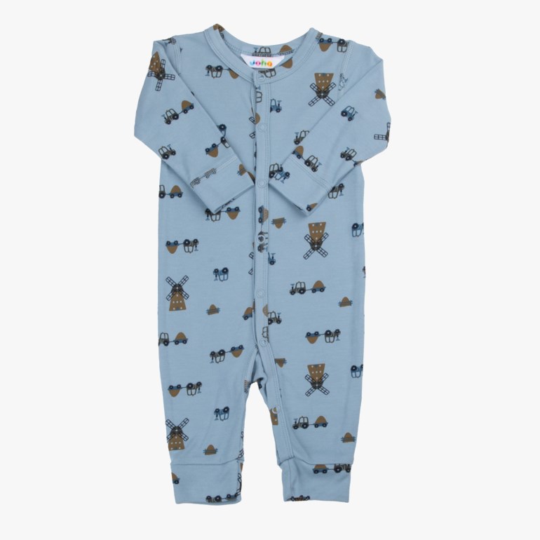 Denne heldressen er laget av myk og pustende bambus for maksimal komfort. Trykknapper foran og ned gjennom det ene benet gjør påkledning enkel. Perfekt for både lek og hvile.