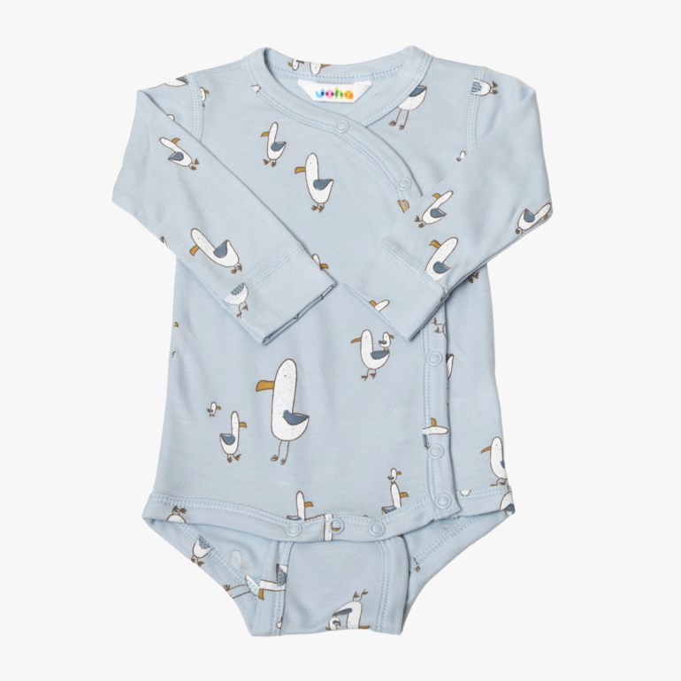 Body med lange ermer og sidelukking for de minste fra Joha. Praktiske trykknapper mellom beina og diagonalt over magen for enklere påkledning. Laget i en deilig, myk viskosekvalitet basert på 100% økologisk bambus med en glatt overflate som er veldig fin å ha på.