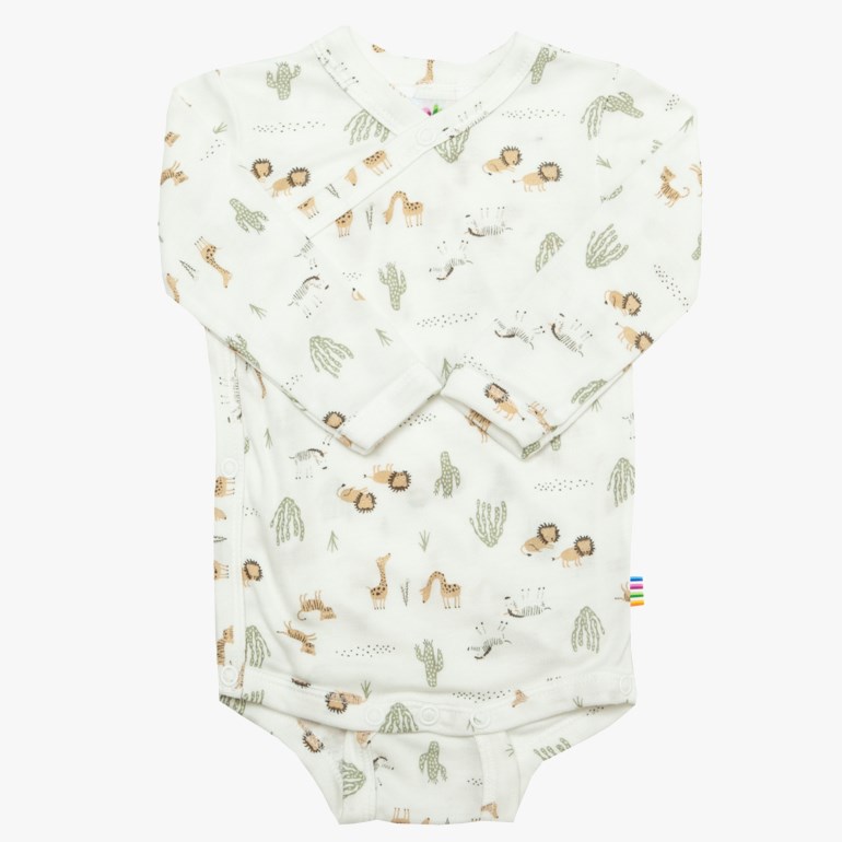 Body med lange ermer og Wrap-around lukning til de minste. Trykknapper mellem bena og skrått over magen for lettere påkledning. En utrolig myk kvalitet baseret på 100 prosent økologisk bambus som er deilig behagelig å ha på. Søtt print. Oeko-tex 100 merket.