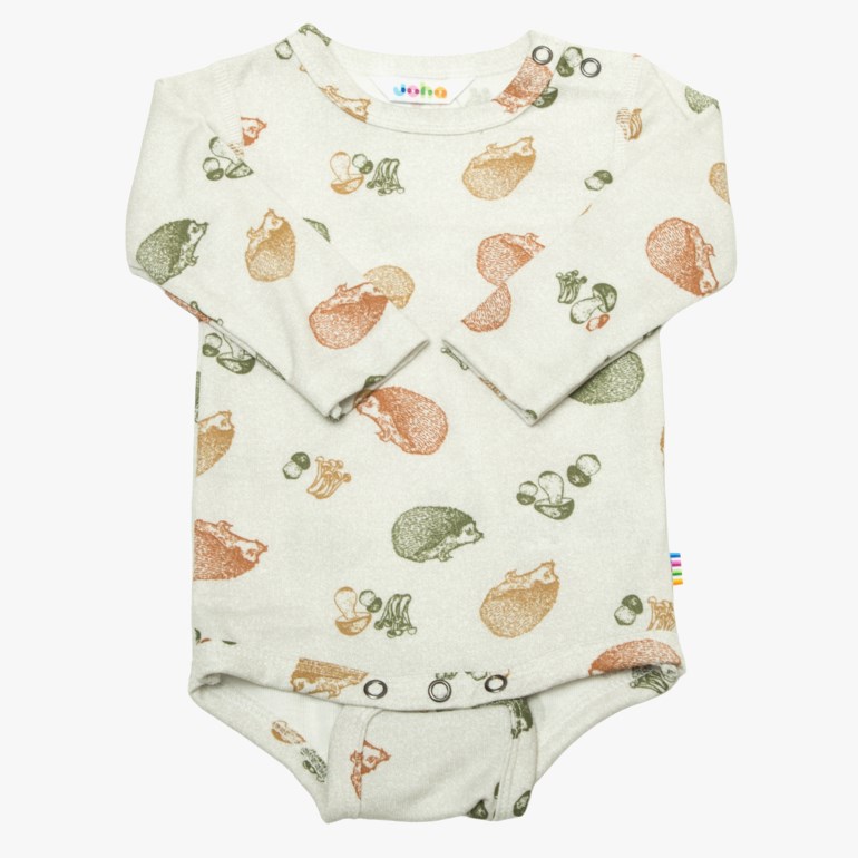 Body med lange ermer. Trykknapper på den ene skulderen og mellom bena. En utrolig myk kvalitet basert på 100 prosent organisk bambus som er veldig fin å ha på seg. Søt trykk. Oeko-tex 100-merke.
