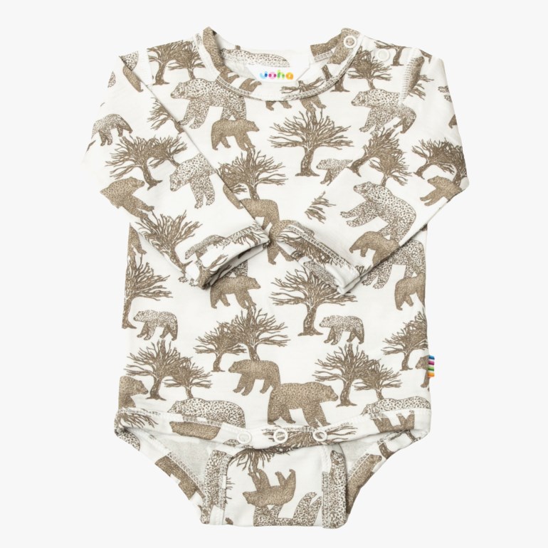 Body med lange ermer, med nydelig mønster av bjørner og naturelementer. Inkluderer praktiske trykknapper på den ene skulderen og mellom beina for enkel påkledning, og er laget i en fin og lett ullkvalitet som er veldig behagelig å ha på.