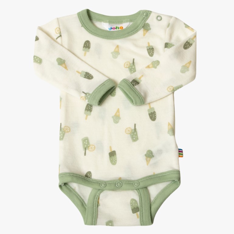 Body med lange ermer. Trykknapper på den ene skulderen og mellom bena for lettere påkledning. En myk og lett ullkvalitet med god strekkbarhet som er fin og behagelig å bruke på innsiden. Søtt trykk med kontrasterende kanter. Ren merinoull og merket Oeko-tex 100.
