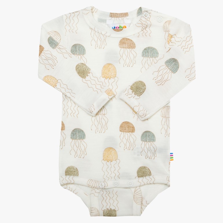 Body med lange ermerog trykknapper på den ene skulderen samt mellom bena. En ekstra fin ullkvalitet med silke. Utrolig myk og med et litt skinnende uttrykk gjør denne kvaliten ekstra fin og lekker. Pure merino wool og Oeko-tex 100 merket.
