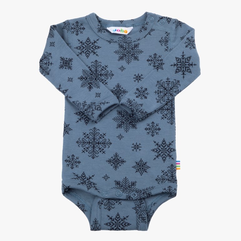 Denne bodyen med lange ermer er laget av myk og lett ribbestrikket merinoull, som gir god strekkbarhet og er svært behagelig mot huden. Trykkknappene på den ene skulderen og mellom bena gjør påkledningen enkel. Bodyen er dekorert med et fint snøfnuggmønster, og er laget av ren merinoull med Oeko-tex 100-sertifisering, som garanterer at den er fri for skadelige kjemikalier.