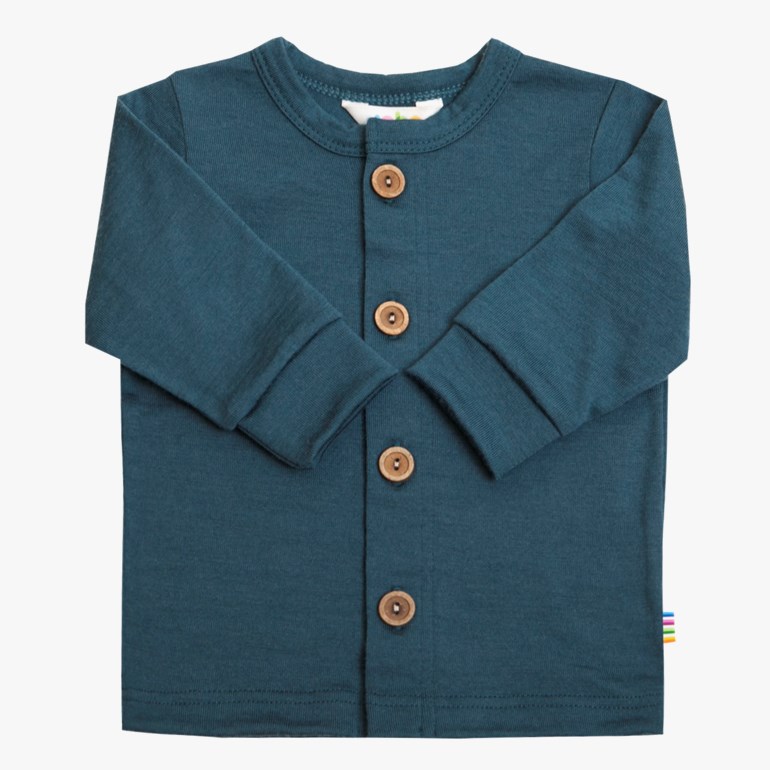 Cardigan med fine bambusknapper foran. Søtt lite broderi i nakken som søt detalje. En ribbet, super myk og lett ullkvalitet med god strekkevne som er deilig behagelig å ha på.Pure merino wool og Oeko tex 100 merket.