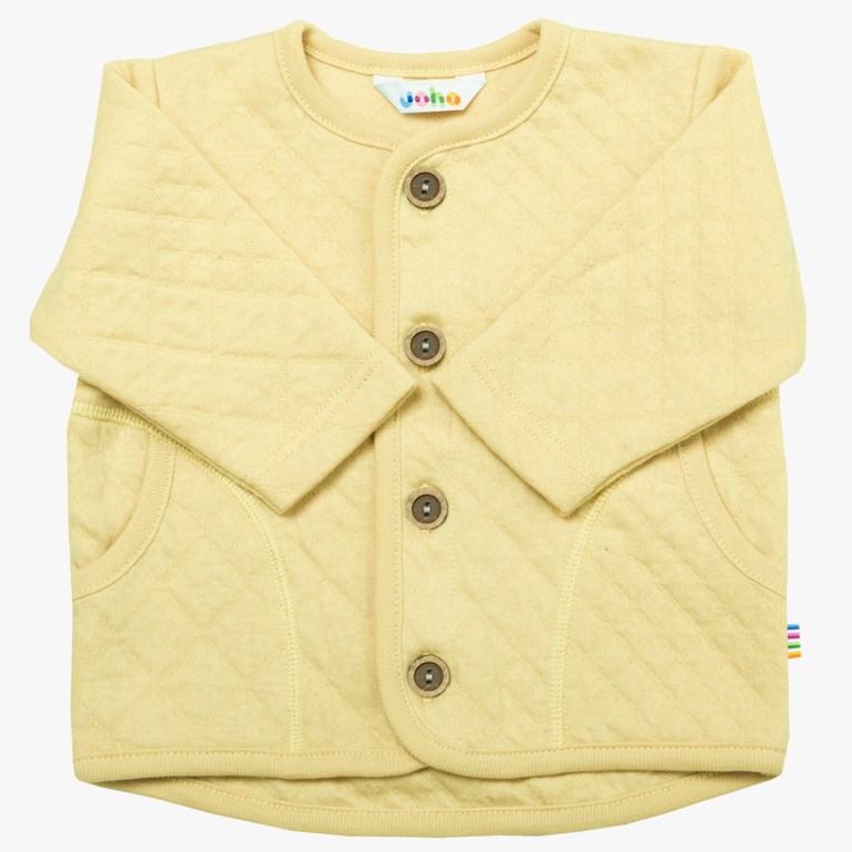 Cardigan lukkes med knapper og sidelommer som søte detaljer. En stabil og lett quilt med flott rundemønster i en lekker myk økologisk bomull. Oeko-tex 100 merket.