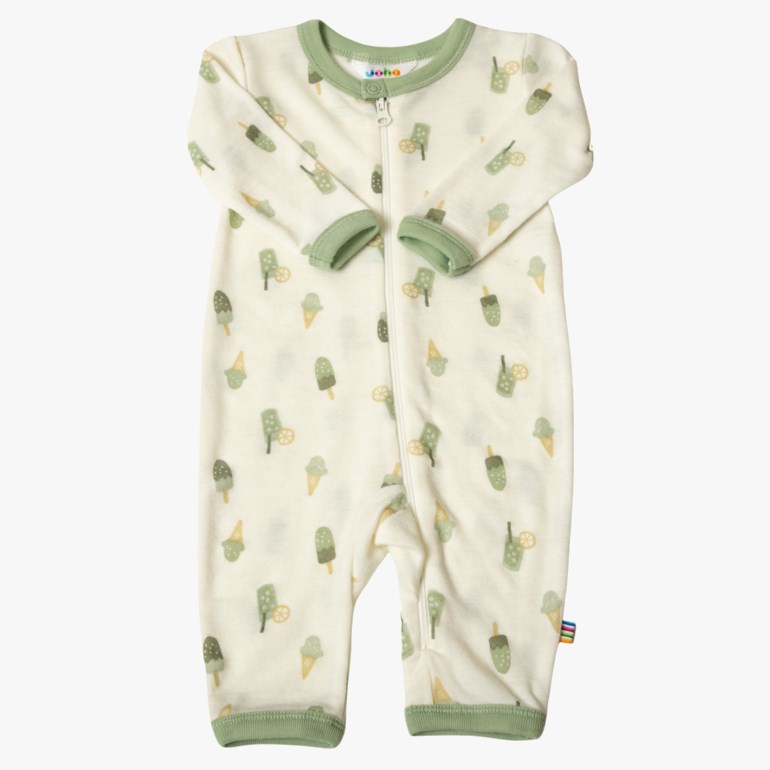 Heldress med lange ermer. Glidelås foran og ned langs det ene benet og trykknapp i nakken. En ribbet, myk og lett ullkvalitet med god strekkbarhet som er fin og behagelig å ha på. Søtt trykk med kontrasterende kanter. Ren merinoull og merket Oeko-tex 100