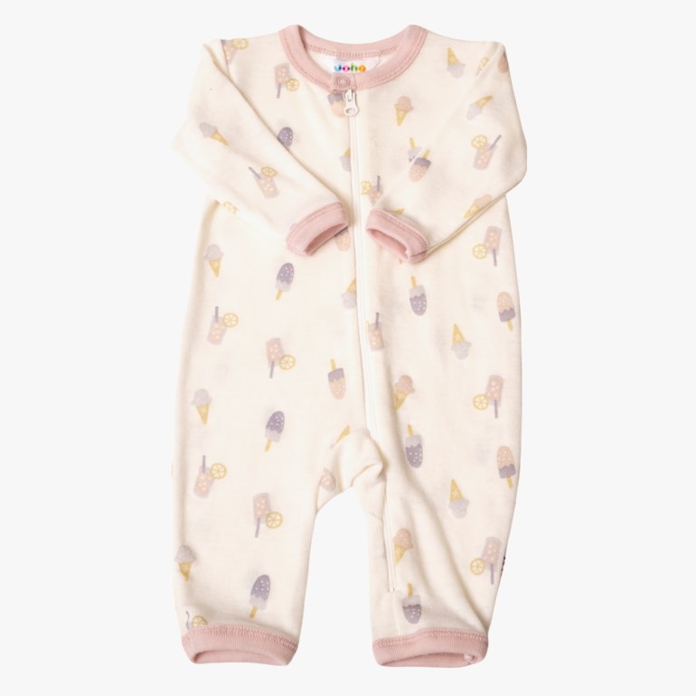 Heldress med lange ermer. Glidelås foran og ned langs det ene benet og trykknapp i nakken. En ribbet, myk og lett ullkvalitet med god strekkbarhet som er fin og behagelig å ha på. Søtt trykk med kontrasterende kanter. Ren merinoull og merket Oeko-tex 100