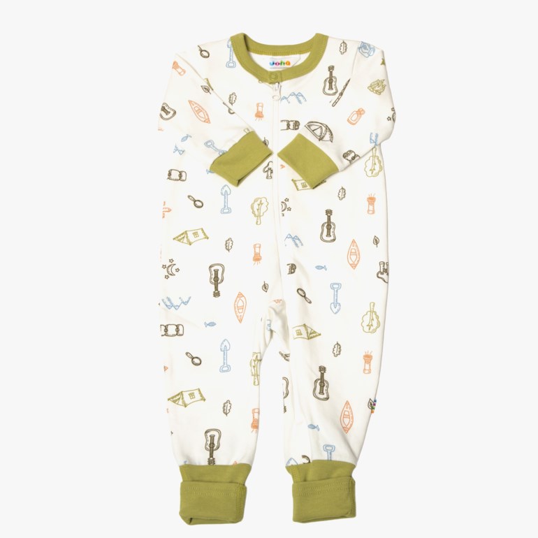 Pysjamas med 2 i 1 fot, altså med fot som kan brettes ut og inn, fra Joha. Lukkes med trykknapp og glidelås som går ned på det ene benet for enklere påkledning. En virkelig myk og elastisk, økologisk bomullskvalitet med lycra som er veldig behagelig å ha på.
