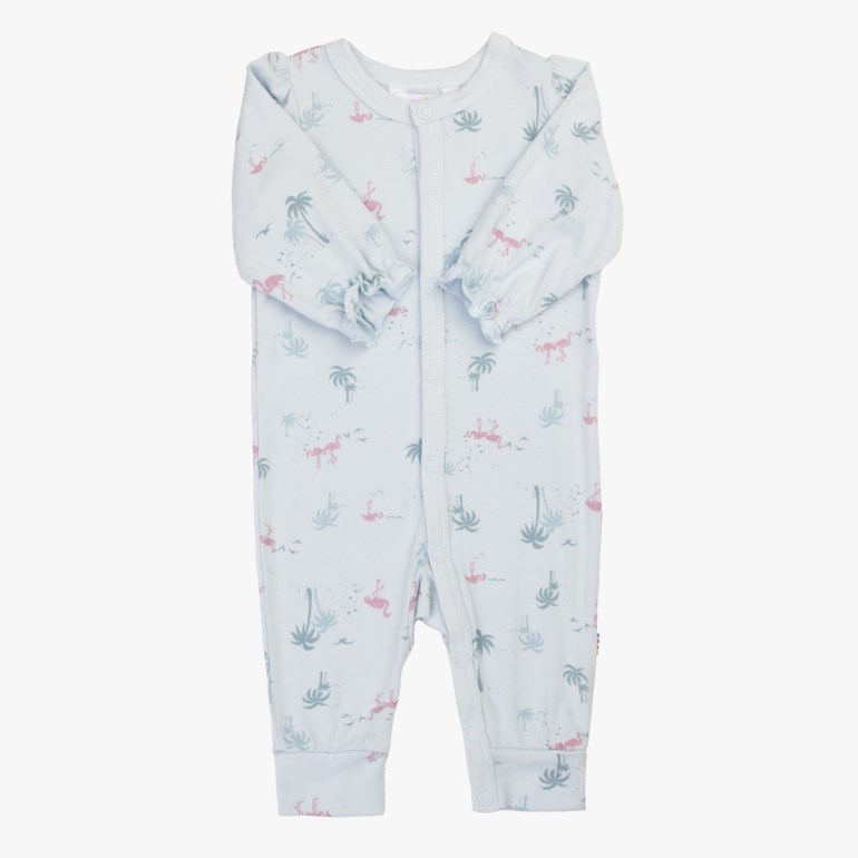 Denne pysjamasen i bambusviskose har trykknapper foran og nedover det ene benet som gjør påkledningen enkel, også når barnet er trøtt. Den glatte kvaliteten oppleves lun uten å bli for varm, og følger barnets bevegelser naturlig gjennom natten. Puffede skuldre og bølgete kanter ved håndleddene gir et mykt og gjennomført uttrykk, mens det søte trykket gjør pysjamasen til en hyggelig del av leggetiden.