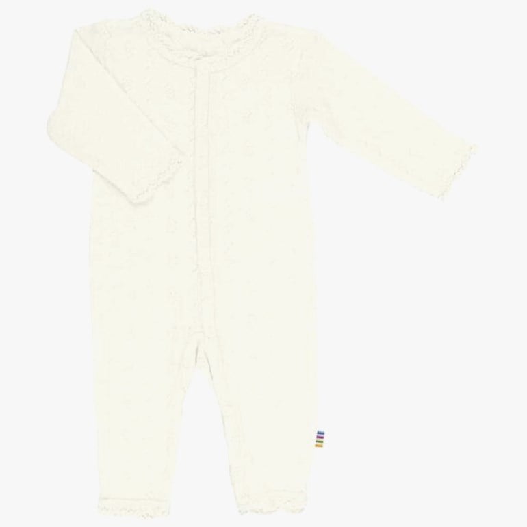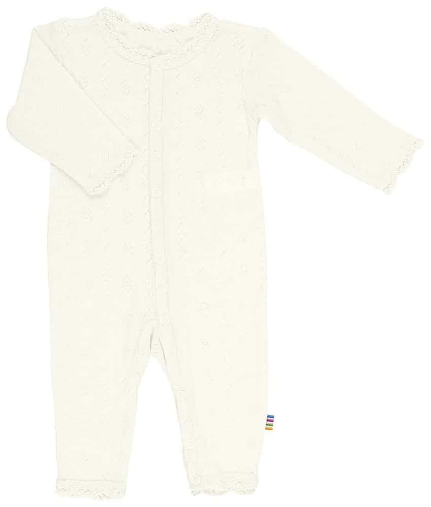 Denne heldressen kombinerer myk ull med silkens letthet og glans. Med delikate blondedetaljer og et søtt hullmønster gir den et eksklusivt uttrykk samtidig som den føles behagelig mot barnets hud. Trykknapper hele veien ned på det ene benet gjør påkledningen enkel.