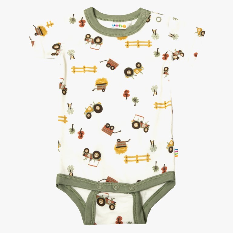 Body med korte ermer. Trykknapper på den ene skulderen og mellom bena. En utrolig myk kvalitet basert på 100% organisk bambus som er fin og behagelig å ha på. Søtt trykk med solide kanter. Oeko-tex 100 merke.